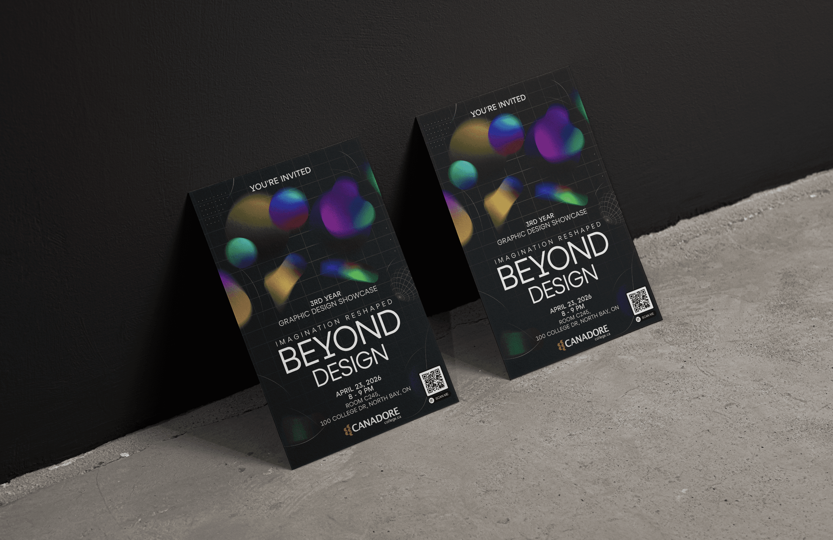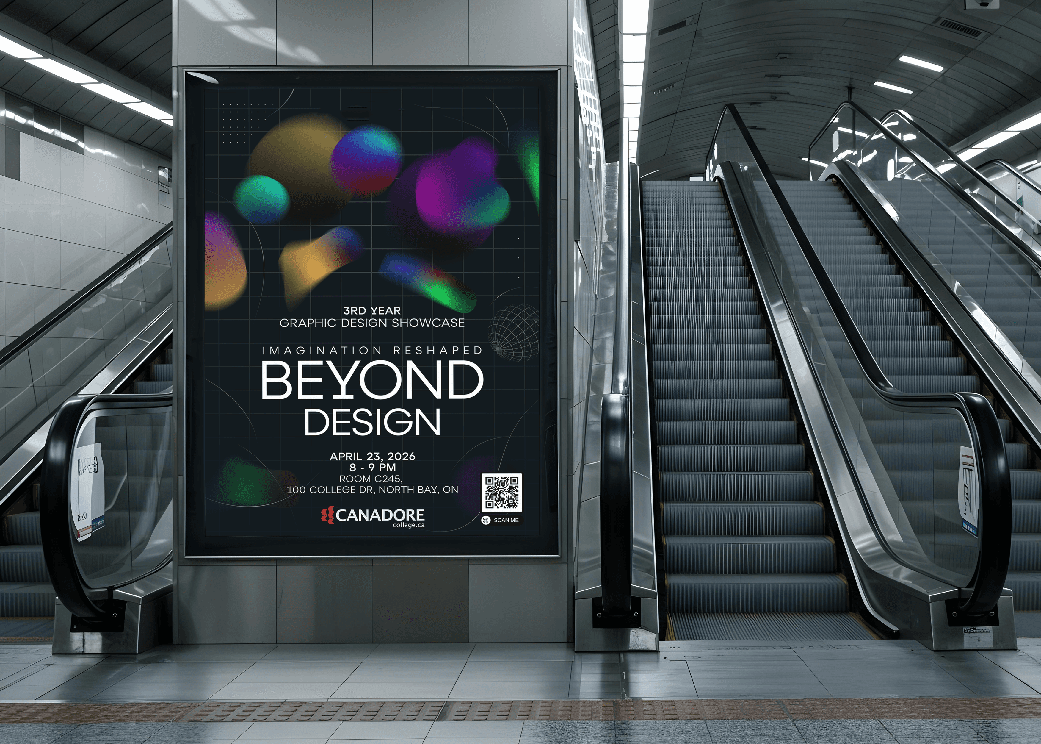 This project focused on creating the visual identity and promotional campaign for the Canadore College Graphic Design Showcase event. My concept, Beyond Design, was built around the idea of pushing creativity past what is expected, using floating abstract gradient forms, a dark atmospheric background, and clean typography to create a look that felt futuristic, immersive, and professional. The goal was to design something that could promote the event clearly while also capturing the energy, innovation, and evolving identity of third-year graphic design students. What made the project especially important to me was that my design was selected for the actual showcase event, allowing the work to move from concept into a real public-facing piece.